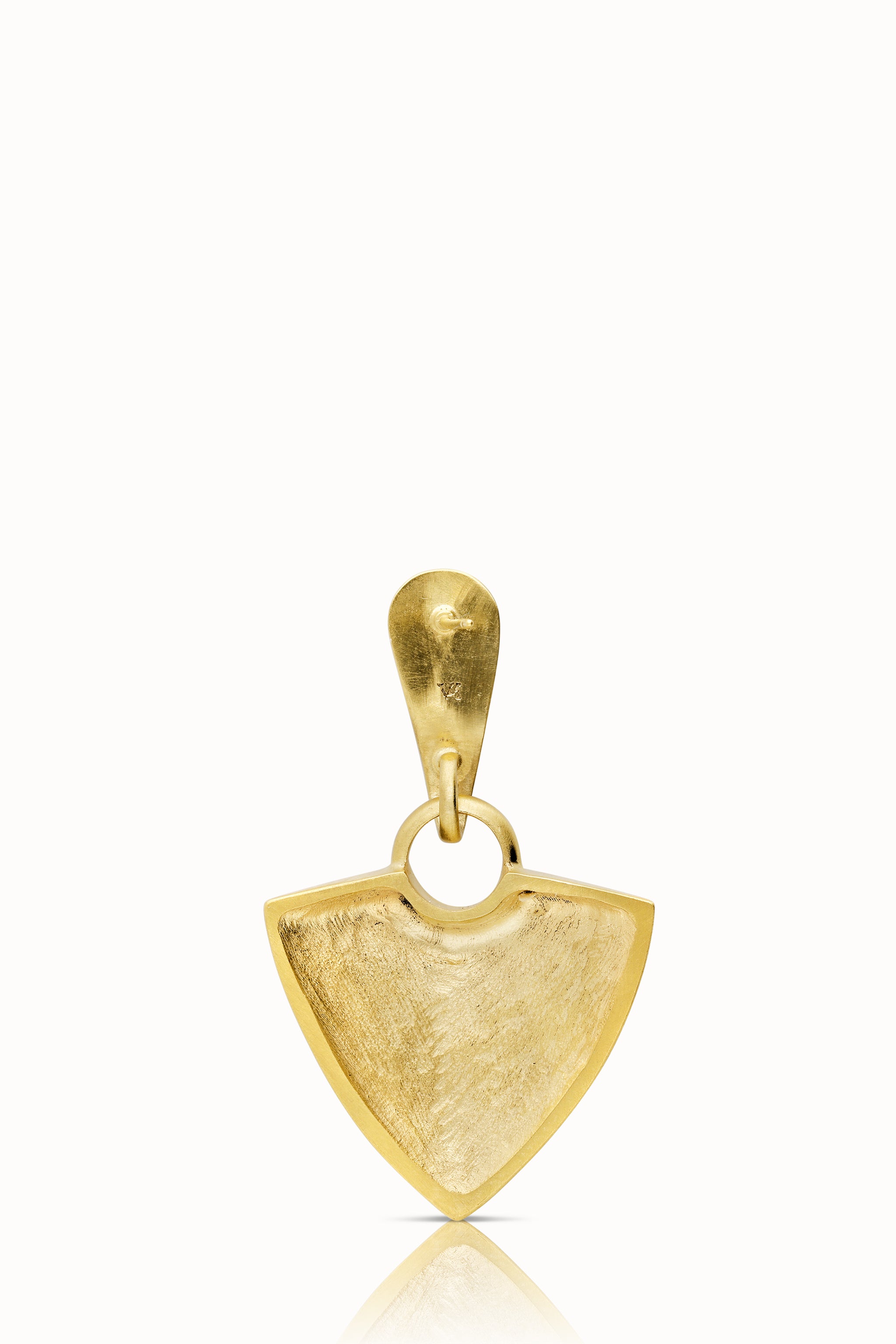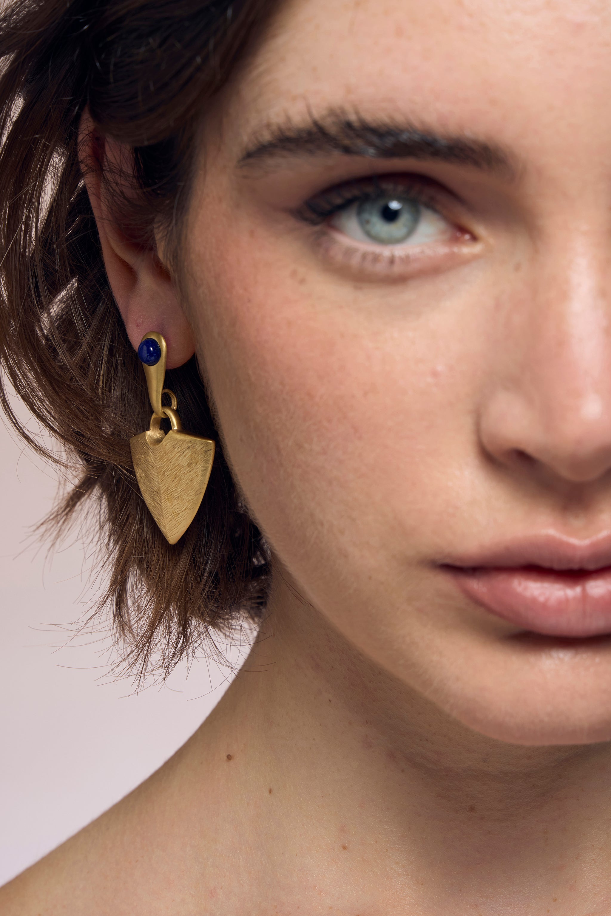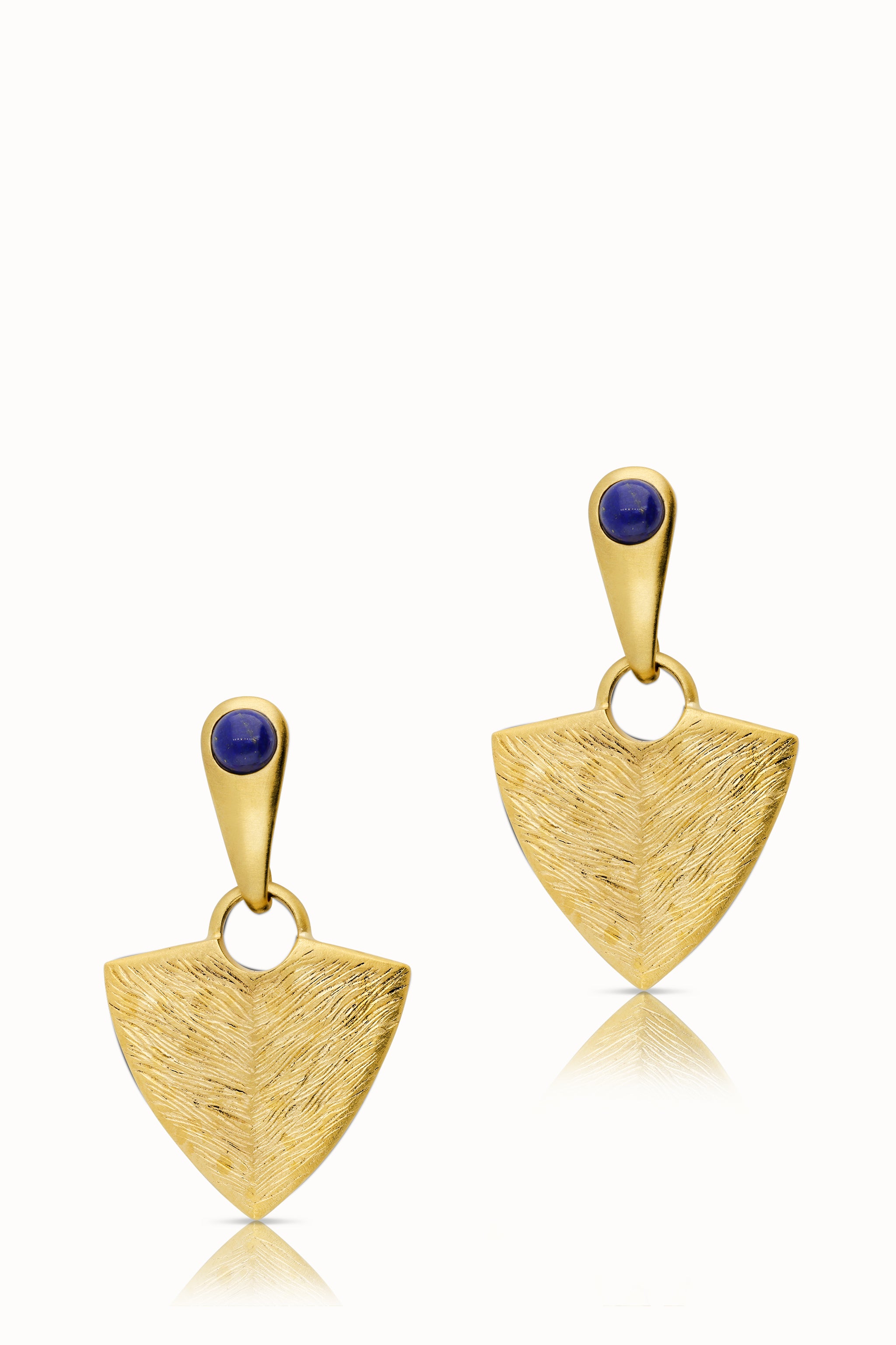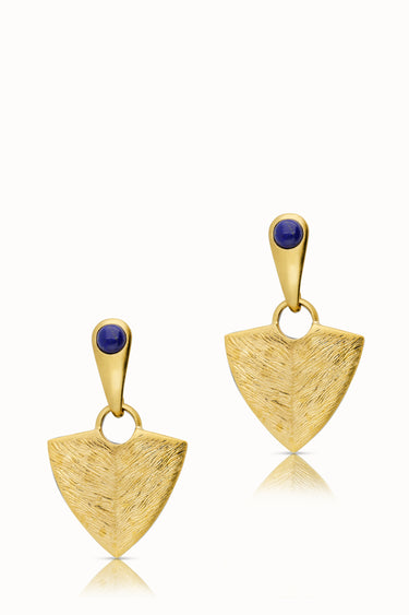 The Heartstrike earrings reinterpret Artemis’ arrow as a soft-edged, heart-shaped arrowhead, its yellow gold surface etched with a bark-like motif that catches light and shadow like sun filtering through a forest. A single bead of midnight-blue lapis lazuli crowns the pendant ring — an echo of the night sky the goddess moves through. Gilded in 24ct gold.