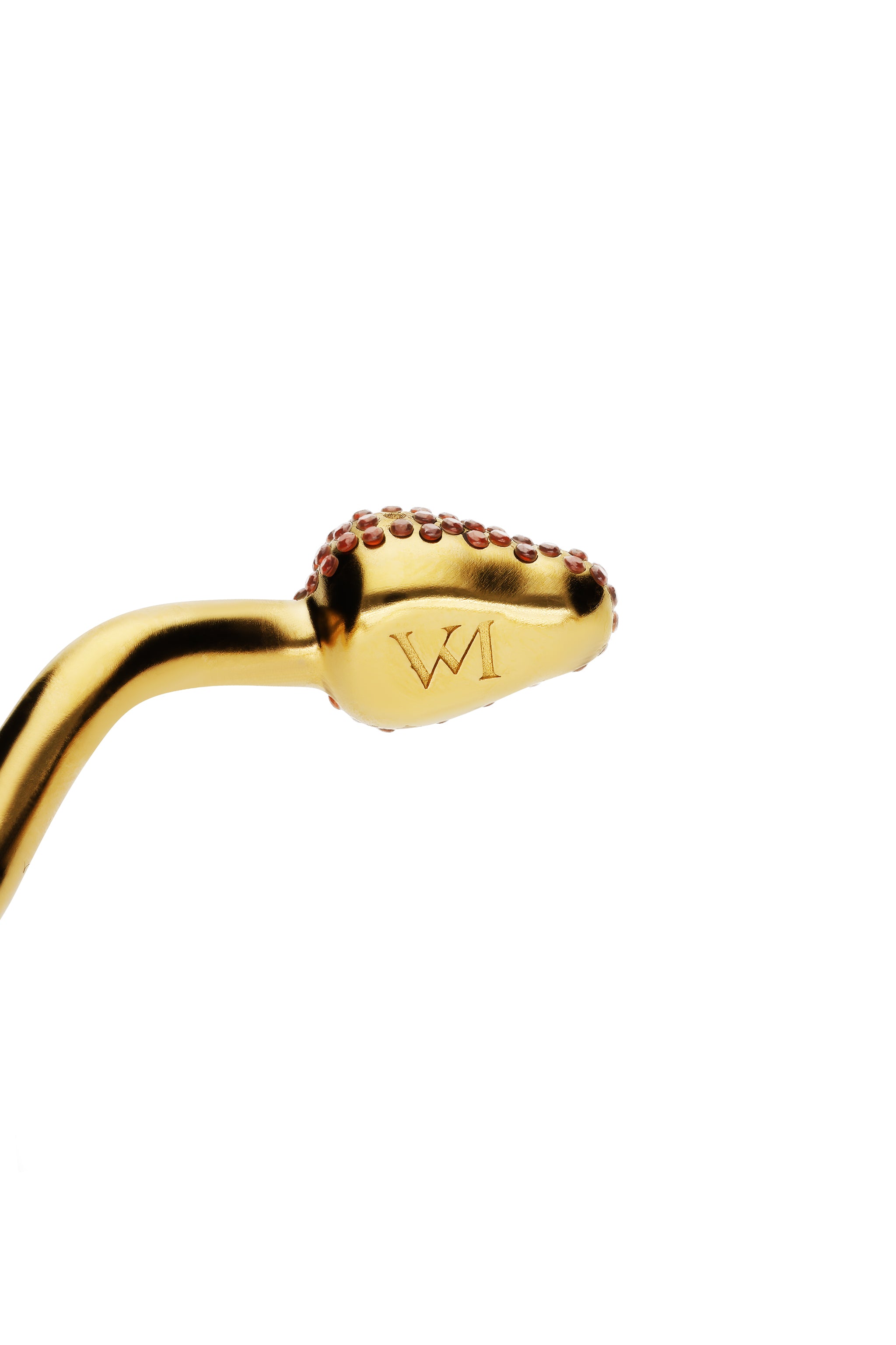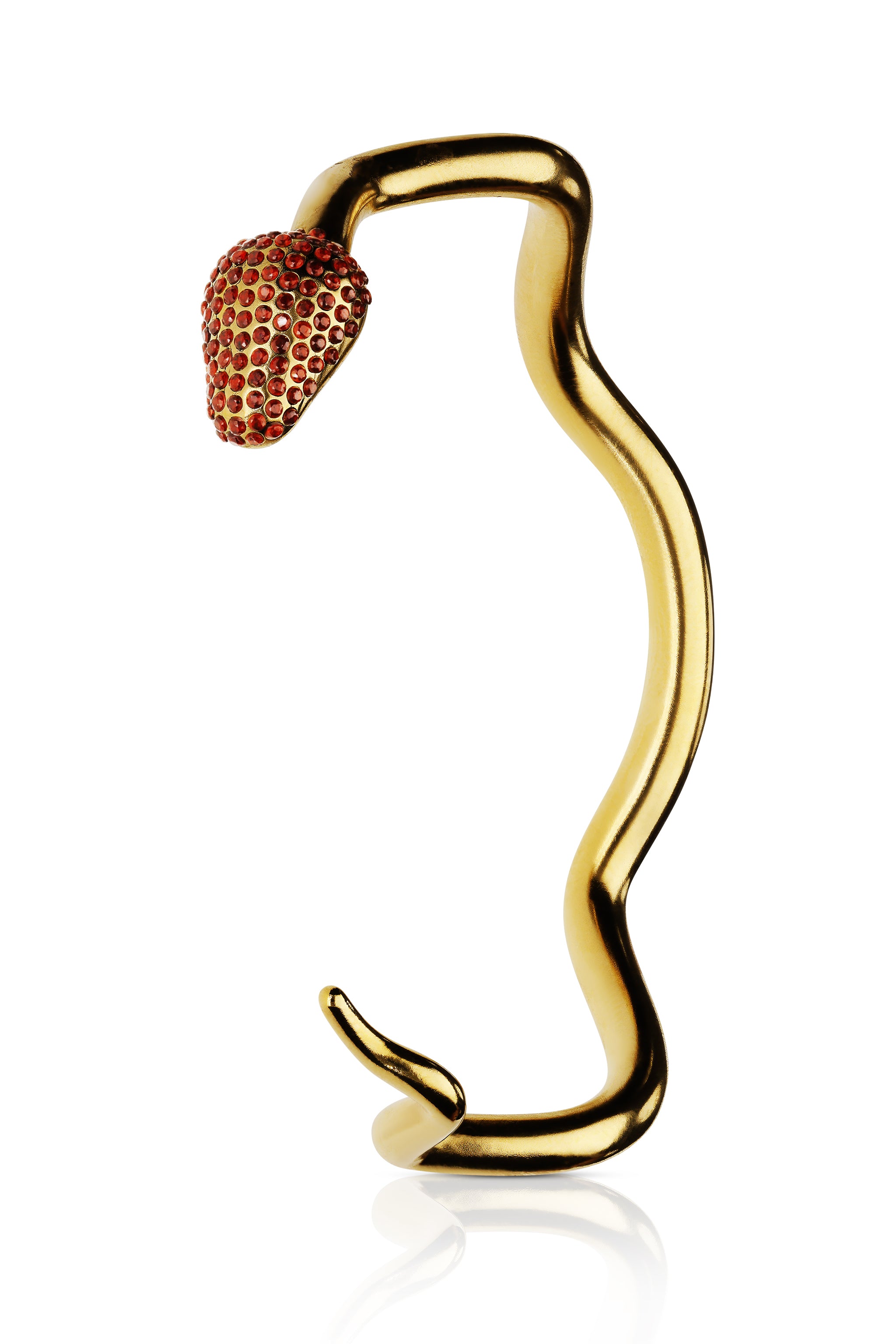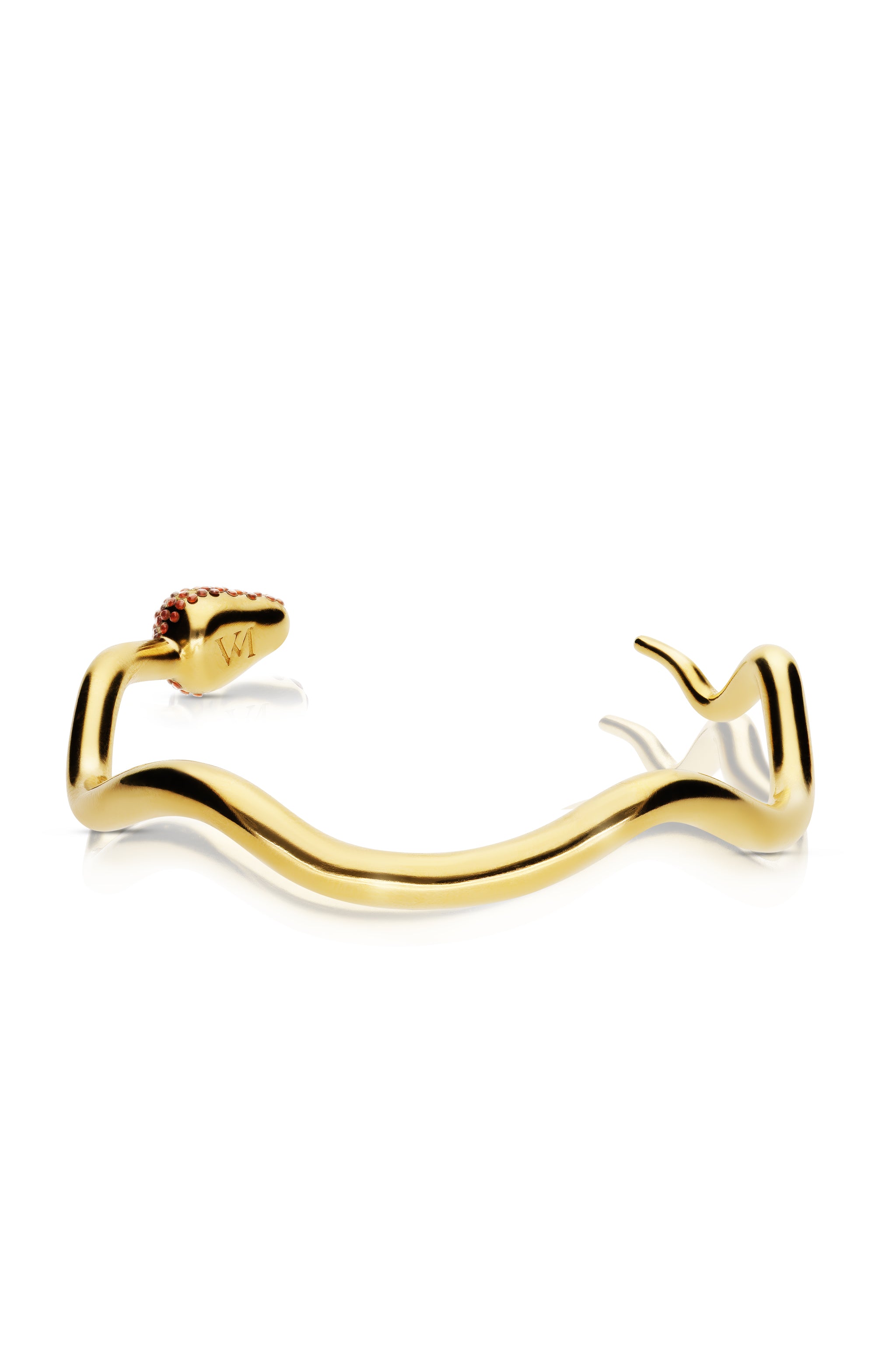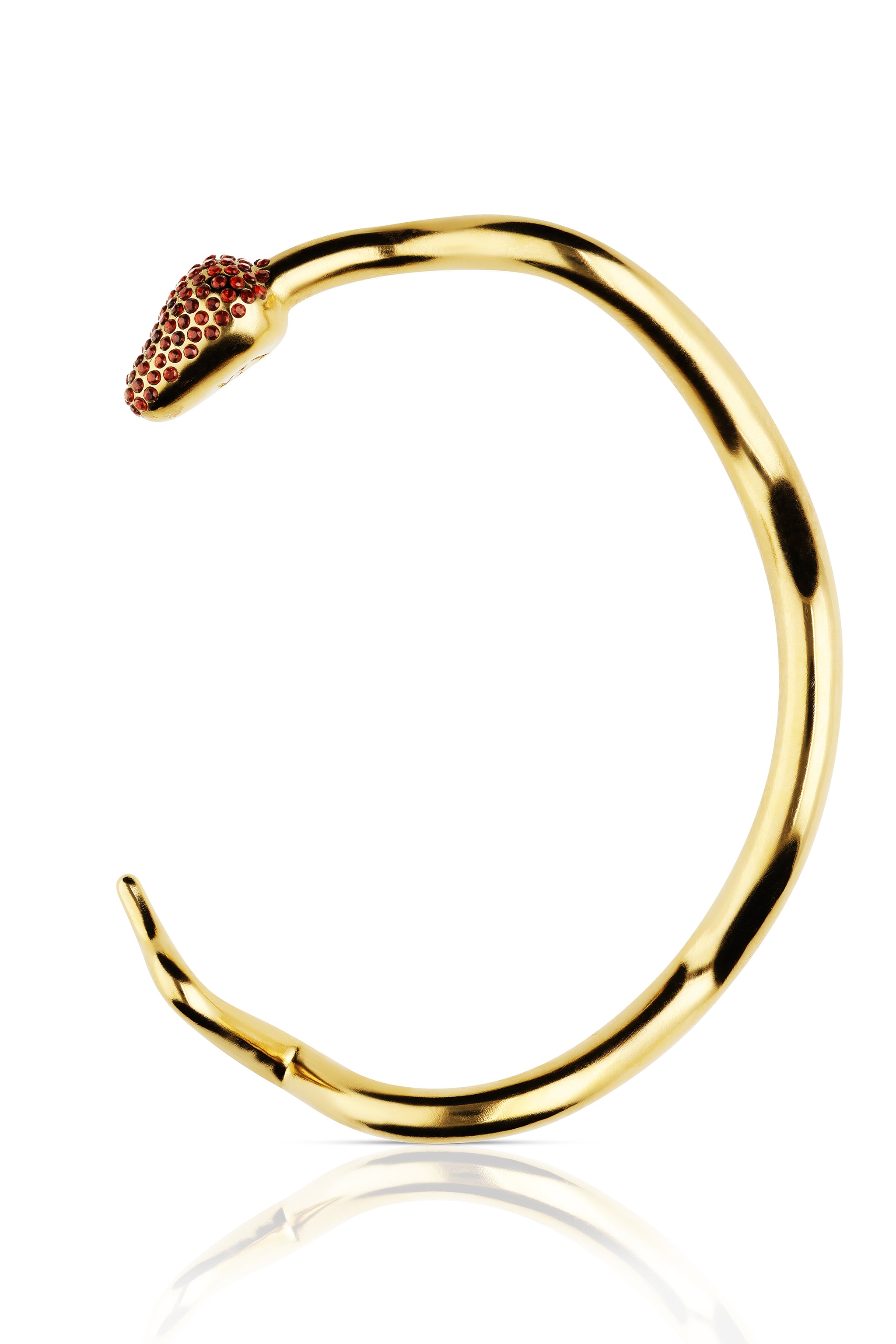 An evolution of the Quietude bracelet, this yellow gold cuff wraps sinuously around the wrist — almost a perfect loop. Its head, paved with deep red garnets, catches the light with every movement, bringing warmth and intensity to its calm, sculptural form. Named The Deborah, it expresses confidence and presence. Wear it alone or layered with other yellow and white gold bracelets. Gilded in 24ct gold.